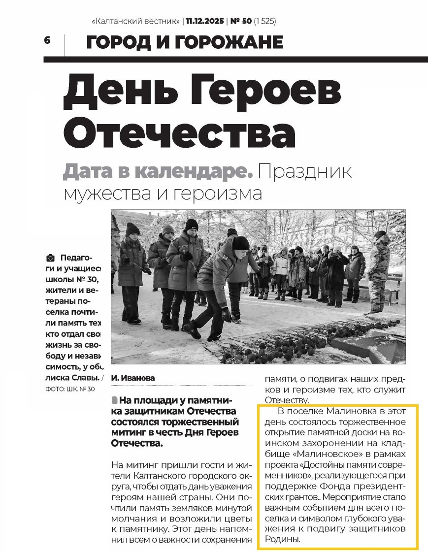 Глава поселка Н. Шнидорова обратилась к участникам мероприятия с приветственным словом, подчеркнув важность сохранения памяти о героях для будущих поколений. Руководитель проекта "Достойны памяти современников" И. Комякова рассказала присутствующим о целях и задачах проекта, направленного на увековечивание памяти земляков, отдавших свои жизни за Родину. Минутой молчания собравшиеся почтили память павших героев. Затем к обелиску Славы были возложены цветы – символ вечной благодарности и уважения. После завершения торжественной части на площади участники мероприятия переместились на воинское захоронение на кладбище Малиновское, где была установлена памятная табличка о том, что здесь находится воинское захоронение солдат и офицеров, погибших на специальной военной операции на Украине. К ней также были возложены цветы.