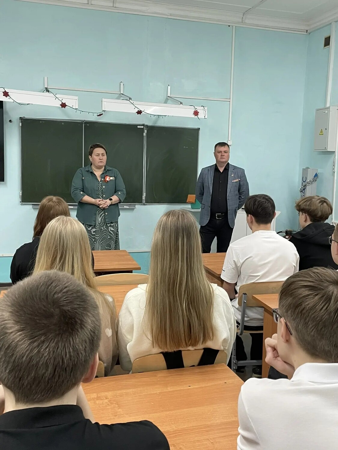 В школе № 18 руководитель проекта «Достойны памяти современников» И. Комякова и социальный координатор государственного фонда «Защитники Отечества» провели общешкольную линейку, где рассказали ученикам о значимости проекта и пригласили их принять активное участие в его реализации. После линейки, на классном часе в 9 классе, Ирина Владимировна и Владимир Борисович обсудили с ребятами важность сохранения памяти о погибших в ходе СВО, а также возможные способы внесения личного вклада в общую победу.